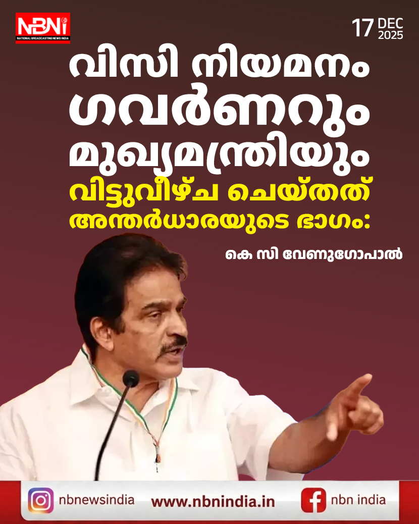 *വിസി നിയമനം ഗവര്ണറും മുഖ്യമന്ത്രിയും വിട്ടുവീഴ്ച ചെയ്തത് അന്തര്ധാരയുടെ ഭാഗം: കെ സി വേണുഗോപാൽ*
