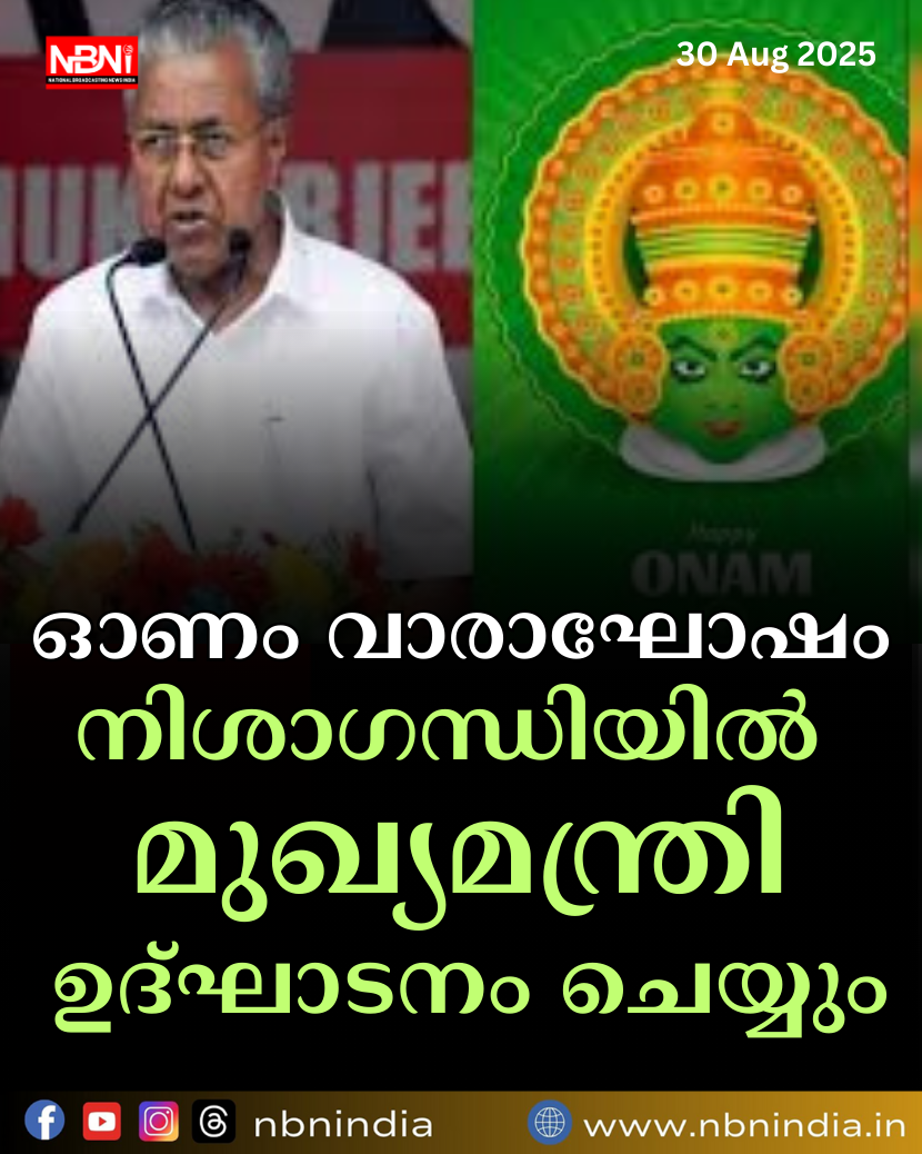 ഓണം വാരാഘോഷം: നിശാഗന്ധിയിൽ മുഖ്യമന്ത്രി ഉദ്ഘാടനം ചെയ്യും 33 വേദികളിൽ കലാപരിപാടികൾ ബേസിൽ ജോസഫ്, ജയം രവി എന്നിവർ മുഖ്യാതിഥികൾ # ഈ വർഷത്തെ ഓണം വാരാഘോഷത്തിന്റെ സംസ്ഥാനതല ഉദ്ഘാടനം മുഖ്യമന്ത്രി പിണറായി വിജയൻ നിർവഹിക്കും. സെപ്റ്റംബർ മൂന്നിന് വൈകിട്ട് ആറുമണിക്ക് നിശാഗന്ധിയിൽ നടക്കുന്ന ചടങ്ങിൽ സംവിധായകനും നടനുമായ ബേസിൽ ജോസഫ്, തമിഴ് നടൻ ജയം രവി എന്നിവർ മുഖ്യാതിഥികളാകും.