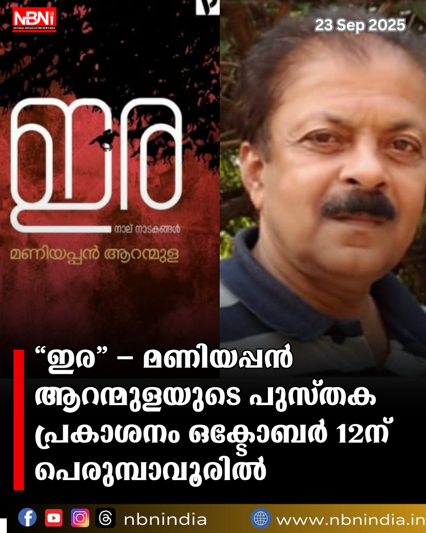 പെരുമ്പാവൂരിൽ ഒക്ടോബർ 13ന് “ഇര”യുടെ പുസ്തക പ്രകാശനം പെരുമ്പാവൂർ: പ്രശസ്ത നാടകസംവിധായകനും തിരക്കഥാകൃത്തും സാഹിത്യപ്രവർത്തകനുമായ ശ്രീ. മണിയപ്പൻ ആറന്മുളയുടെ പുതിയ കൃതി “ഇര”യുടെ പുസ്തക പ്രകാശനം വരും ഒക്ടോബർ 12-ന് പെരുമ്പാവൂരിൽ നടക്കും. പെരുമ്പാവൂർ പുരോഗമന കലാസാഹിത്യ സംഘം, പെരുമ്പാവൂർ താലൂക്ക് ലൈബ്രറി കൗൺസിൽ എന്നിവയുടെ സംയുക്താഭിമുഖ്യത്തിലാണ് ചടങ്ങ് സംഘടിപ്പിച്ചിരിക്കുന്നത്. ലൈബ്രറി കൗൺസിൽ ഹാളിൽ വൈകിട്ട് 3 മണിക്ക് നടക്കുന്ന