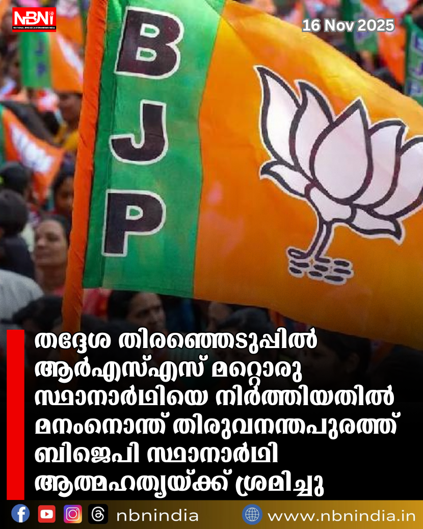 തദ്ദേശ തിരഞ്ഞെടുപ്പില് ആര്എസ്എസ് മറ്റൊരു സ്ഥാനാര്ഥിയെ നിര്ത്തിയതില് മനംനൊന്ത് തിരുവനന്തപുരത്ത് ബിജെപി സ്ഥാനാര്ഥി ആത്മഹത്യയ്ക്ക് ശ്രമിച്ചു