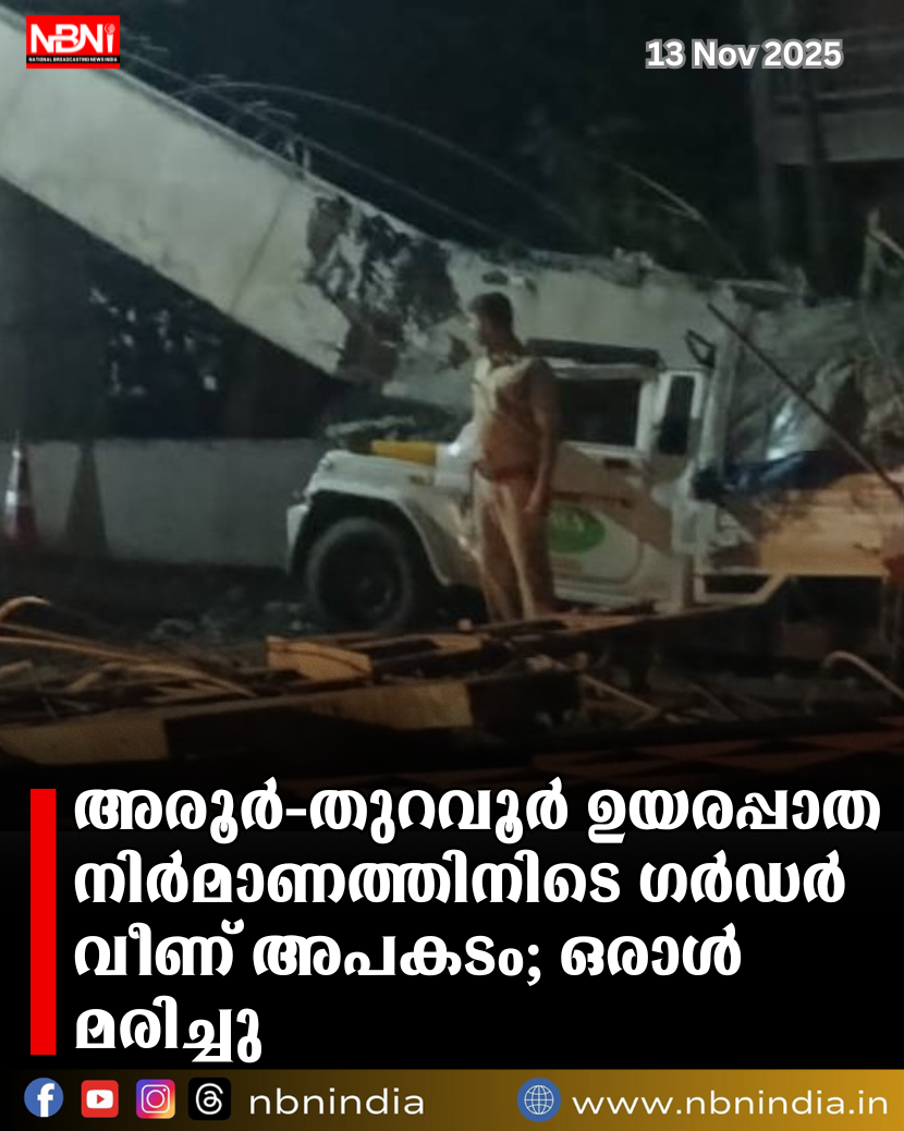 അരൂർ – തുറവൂർ ഉയരപ്പാത നിർമാണത്തിനിടെ ഗർഡർ വീണ് ഒരാൾ മരിച്ചു.