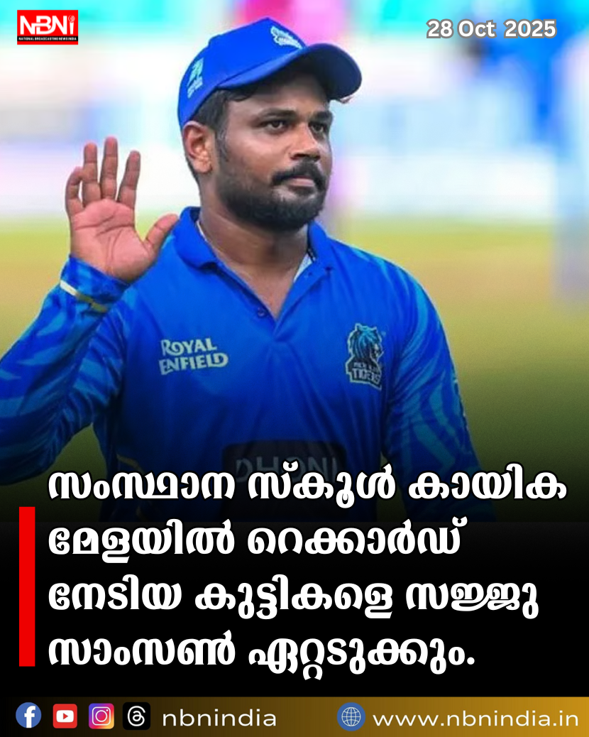 സംസ്ഥാന സ്കൂൾ കായിക മേളയിൽ റെക്കാർഡ് നേടിയ കുട്ടികളെ സജ്ജു സാംസൺ ഏറ്റടുക്കും.